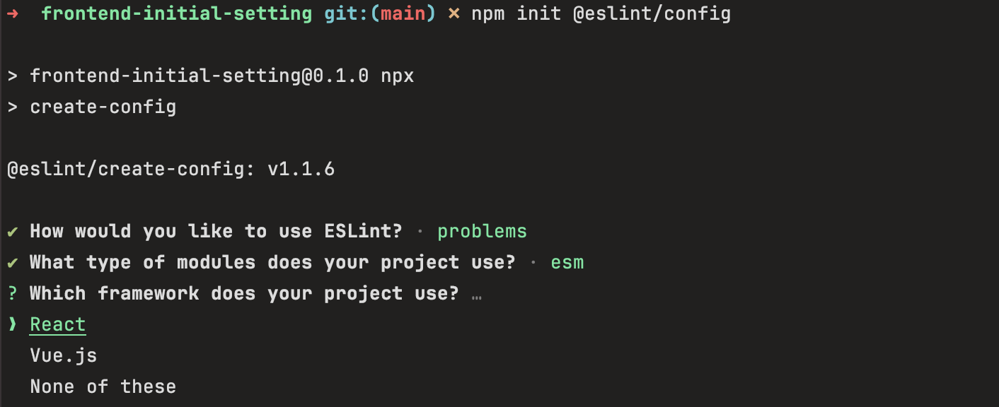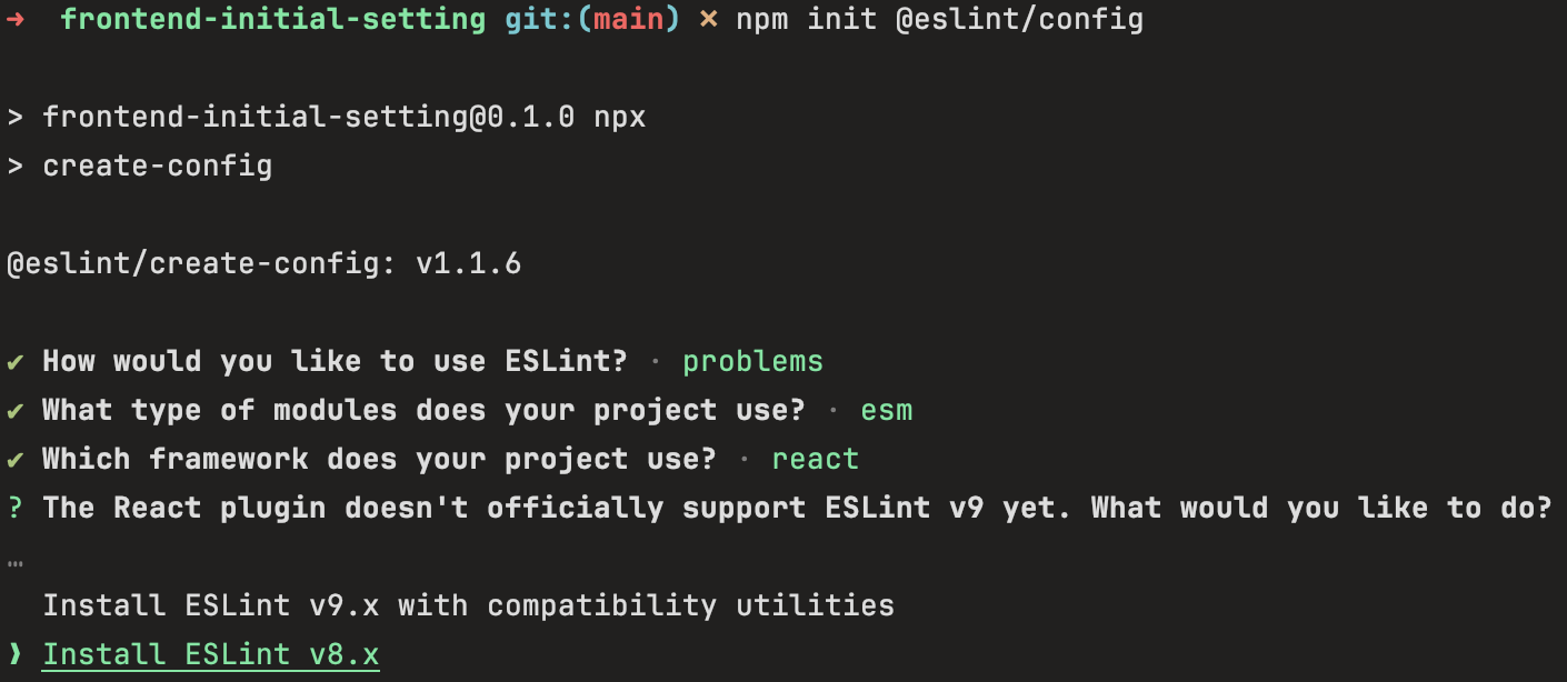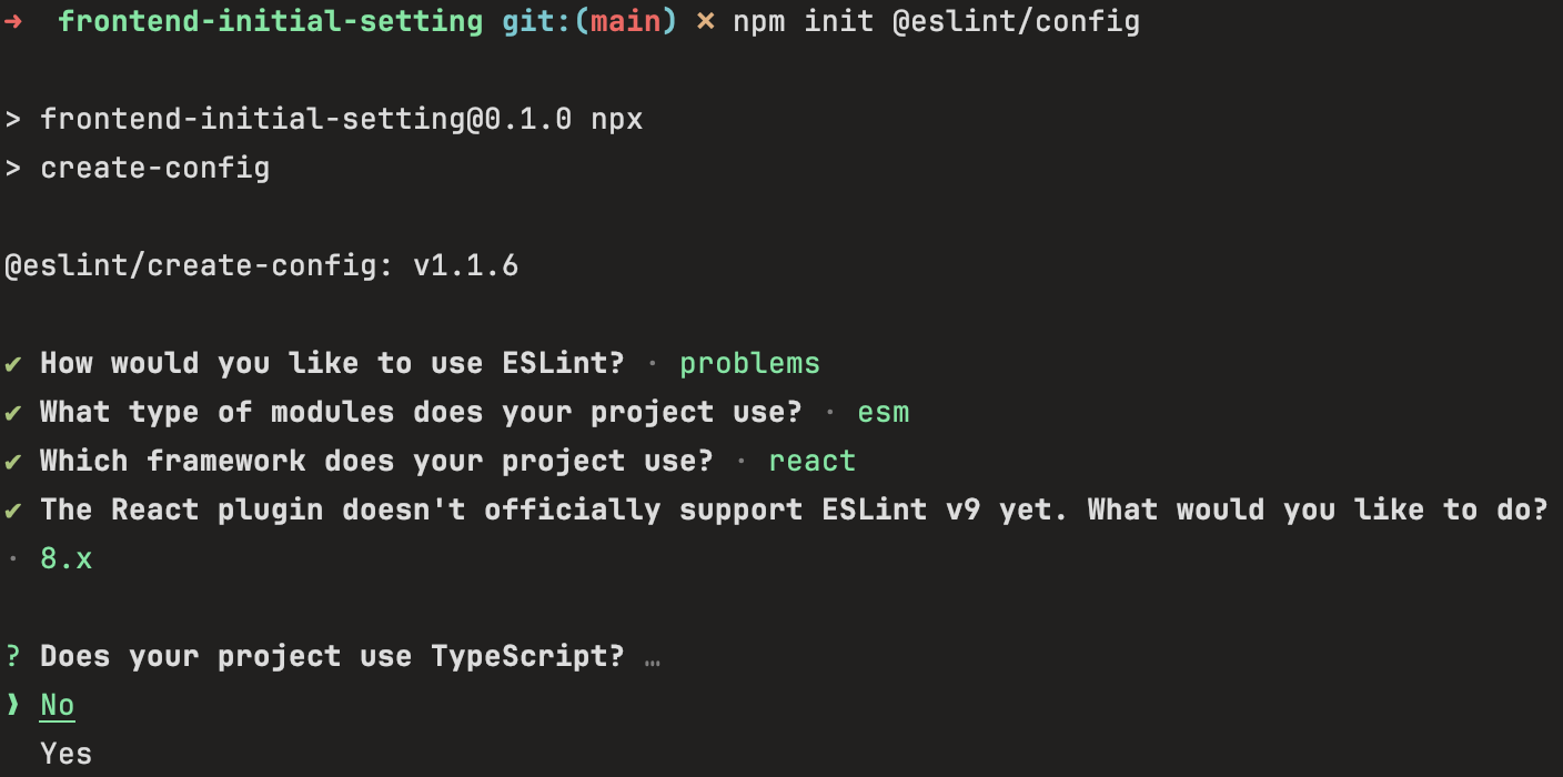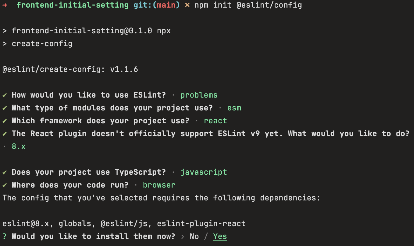 2. 위의 명령어를 입력하면 아래와 같은 질문들을 통해서 eslint.config.mjs 파일이 생성되고 eslint가 설치됩니다!