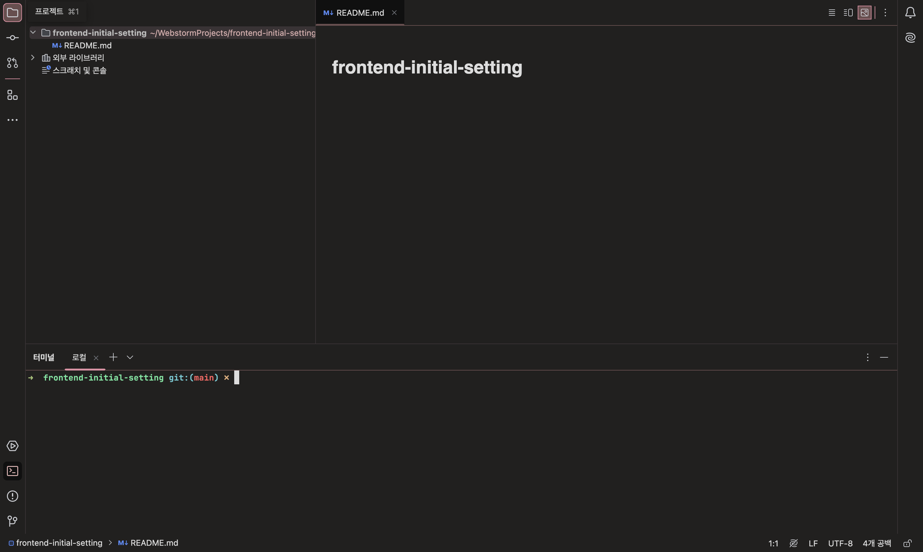 0. 깃허브 repository 생성 후 웹스톰에서 열기