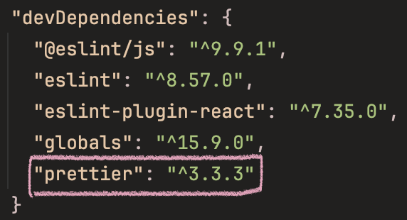 설치를 하게 되면 package.json에 아래와 같이 prettier가 추가되었음을 확인할 수 있습니다. (eslint도 마찬가지)
