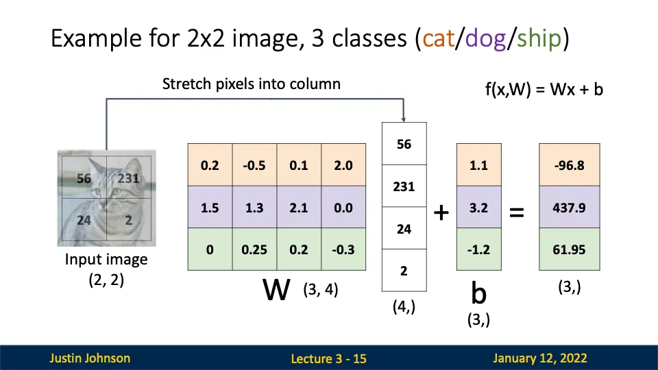 - 가중치 행렬: 각 행은 클래스(cat, dog, ship)에 대한 가중치 템플릿을 나타낸다.