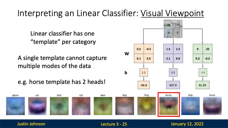 선형 분류기는 각 클래스에 대해 하나의 고유한 템플릿을 학습한다. (템플릿은 해당 클래스의 대표적인 특징을 강조함!)