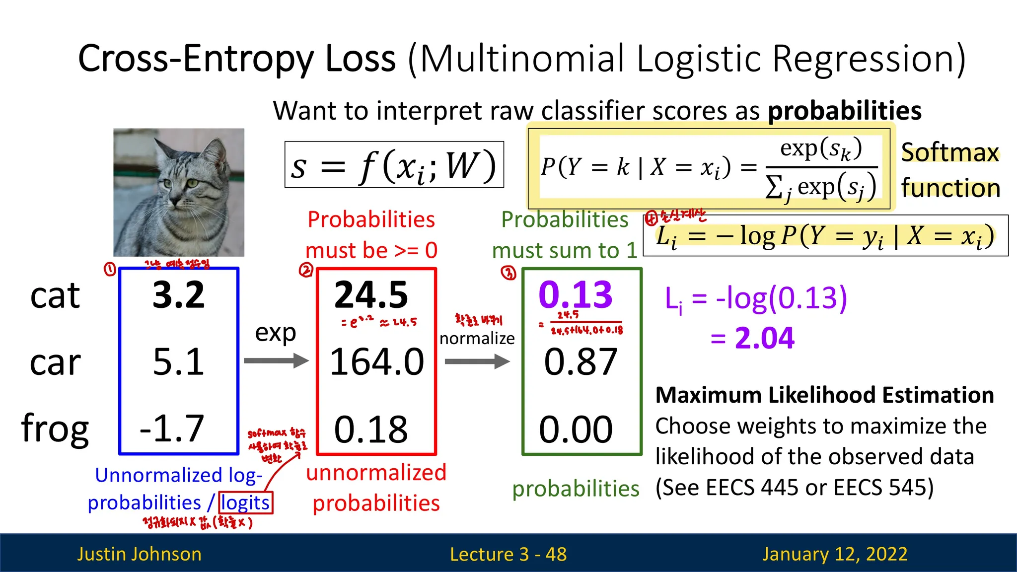 - 정답 클래스에 -log()를 씌우면 됨 → 왜냐면 정답은 하나잔아!! 정답만 1을 곱해주고 나머지는 0을 곱하는 것이기 때문에 그냥 -log()안에 확률값을 넣어주면 끝인 것임