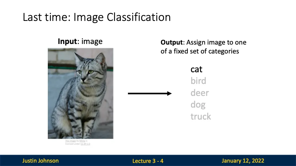 이미지 분류(image Classification)은 고정된 카테고리 중 하나로 이미지를 분류하는 문제이다.