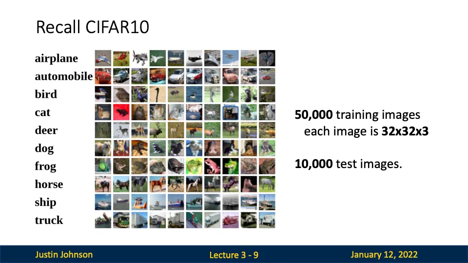 CIFAR-10은 이미지 분류를 위한 데이터셋이며, 다음과 같은 10개의 카테고리를 포함하고 있다.