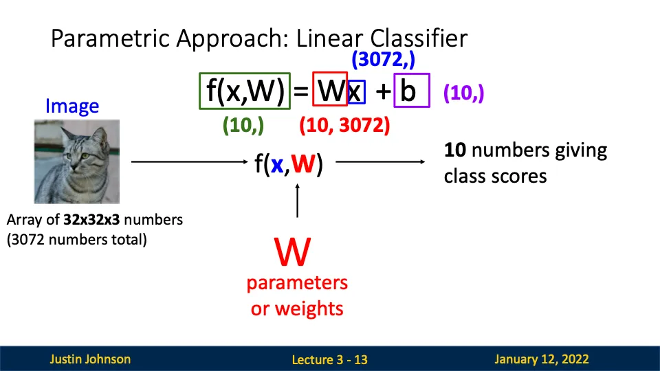 선형 분류기는 학습 가능한 파라미터(가중치 W, 바이어스 b)를 사용한다.