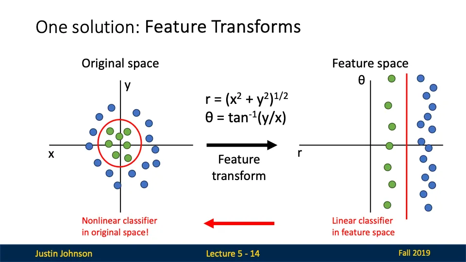 그러나 feature transform을 통해 데이터를 다른 공간으로 변환하여 선형적으로 분리 가능하게 만들 수 있다.