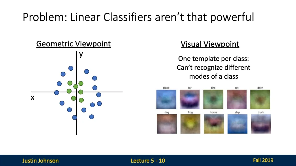 → 위의 그림처럼 클래스가 원형으로 배치된 경우, 단일 직선으로 이들을 분리할 수 없다.(XOR) - 선형 분류기는 각 클래스에 대해 하나의 템플릿만 학습하기 때문에 모양이 쪼꼼만 달라져도 분류를 못할 수도 있다!(말의 2 heads problem)
