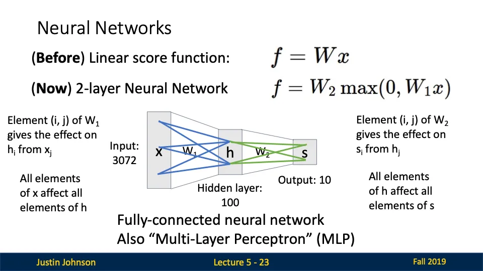 - 각 입력 노드가 은닉층의 모든 노드와 연결되어 있는 구조 + 은닉층의 모든 노드가 출력층의 모든 노드와 연결됨