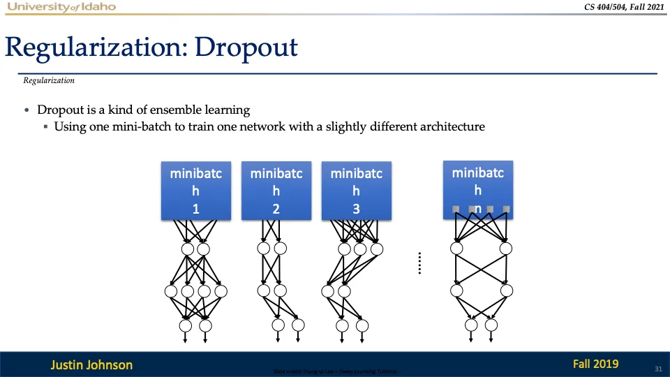 dropout은 일부 뉴런이 제거된 각 미니배치에서 다양한 서브 네트워크를 학습시키는 방법인데, 학습이 완료되면 이러한 서브 네트워크들이 결합된 형태로 동작하여 앙상블 효과를 낸다!