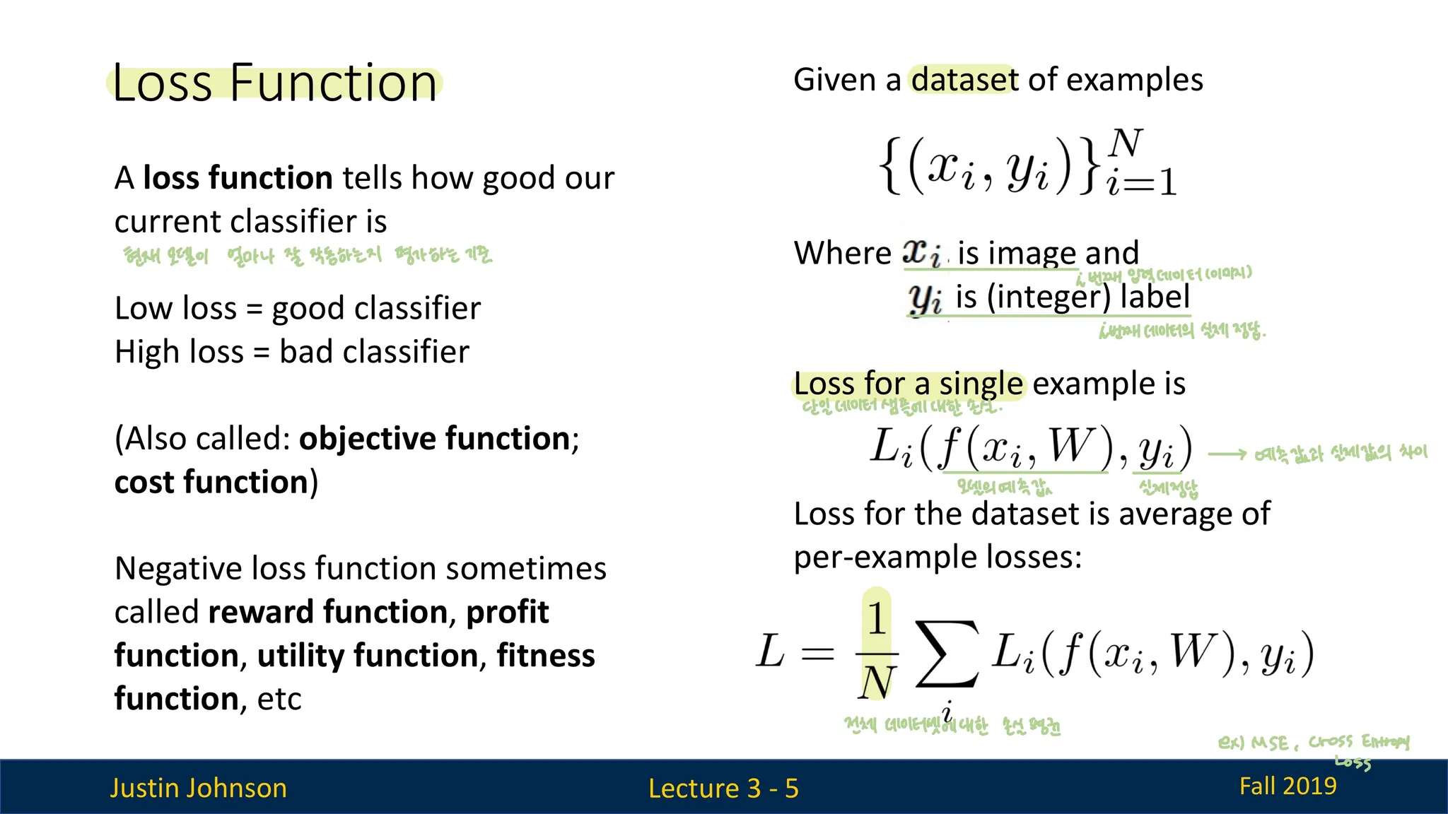 - 대표적인 손실함수에는 MSE와 cross-entropy loss 가 있음