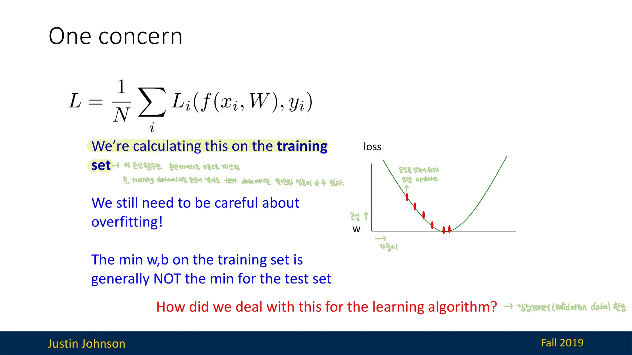 그러나 위의 손실함수는 훈련 데이터(training data)를 기준으로 계산된다.