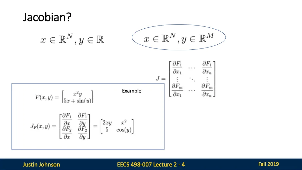 - Jacobian: x의 각 요소 변화가 y의 모든 요소에 어떤 영향을 미치는지 나타내는 행렬.