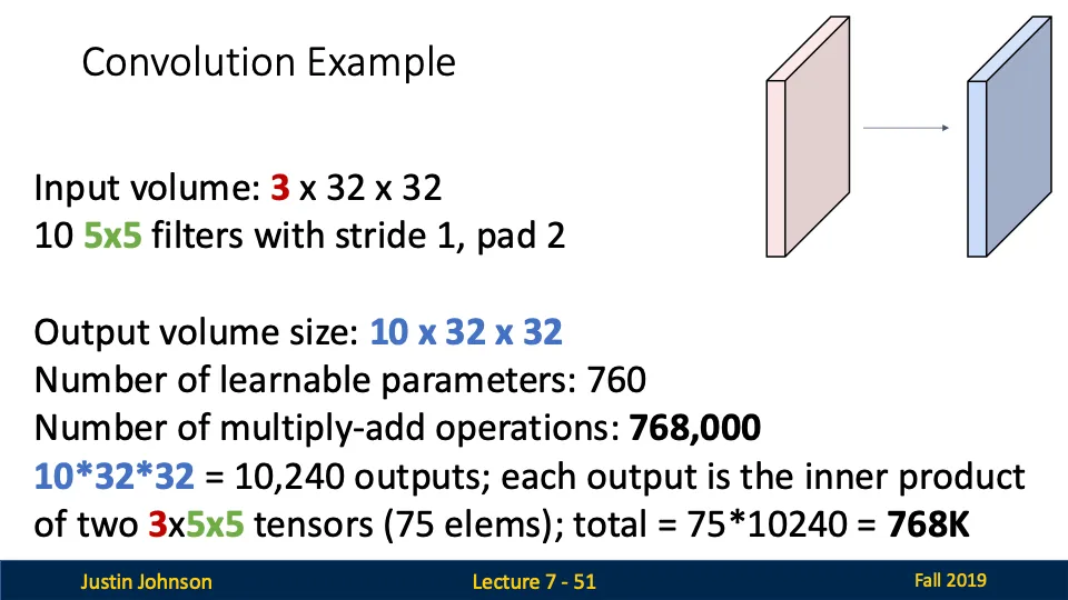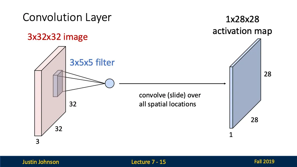 - 공간적 슬라이딩: 필터는 입력 이미지의 공간적 위치를 따라 슬라이딩하며 연산을 수행, 각 슬라이딩 위치에서 하나의 값이 계산됨