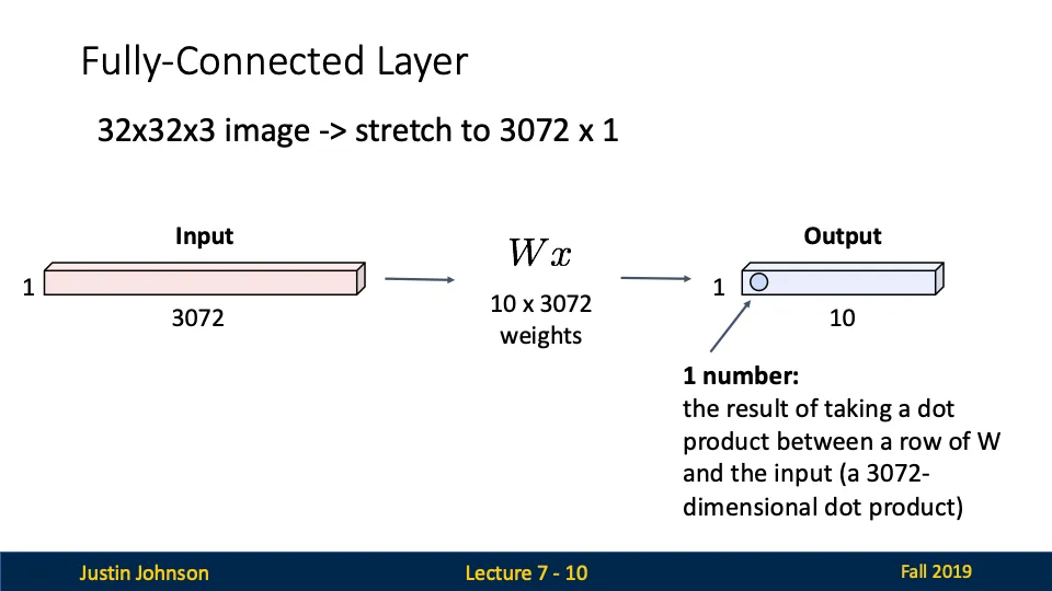 - 연산: W는 10*3072 크기의 행렬로 10차원의 output을 낸다.