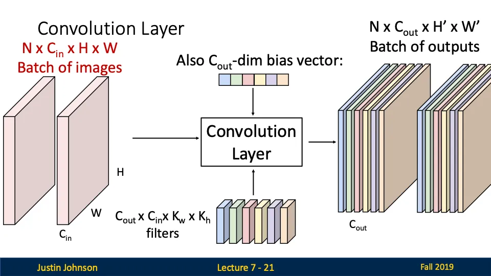 - 필터를 통한 연산: 필터가 입력 이미지 위에서 슬라이딩하며 작은 국소 영역마다 내적을 계산, w^Tx + b 형태로 계산