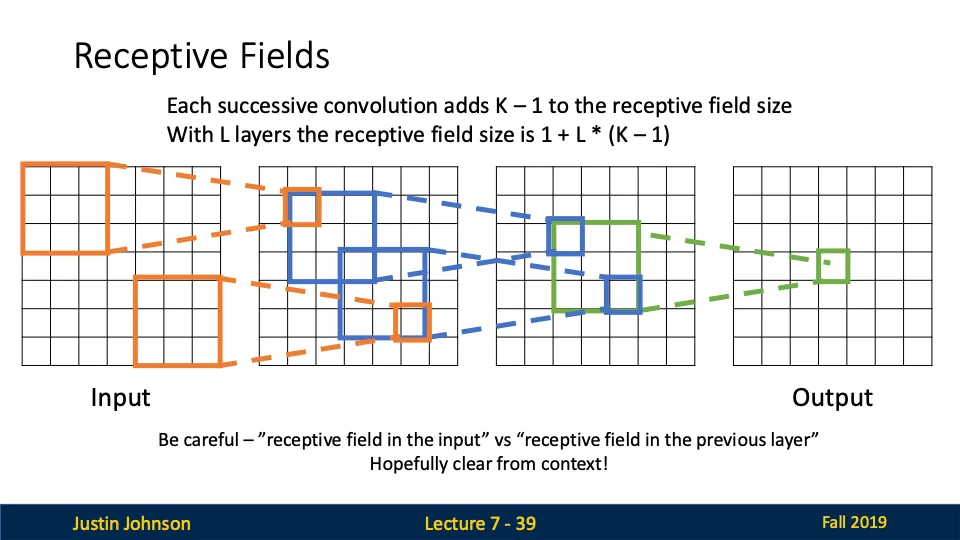 - Receptive Field: 각 출력 뉴런이 입력 이미지에서 영향을 받는 영역