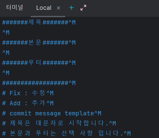 - .gitmessage.txt 파일안에 사용할 commit message template을 작성해줍니다.